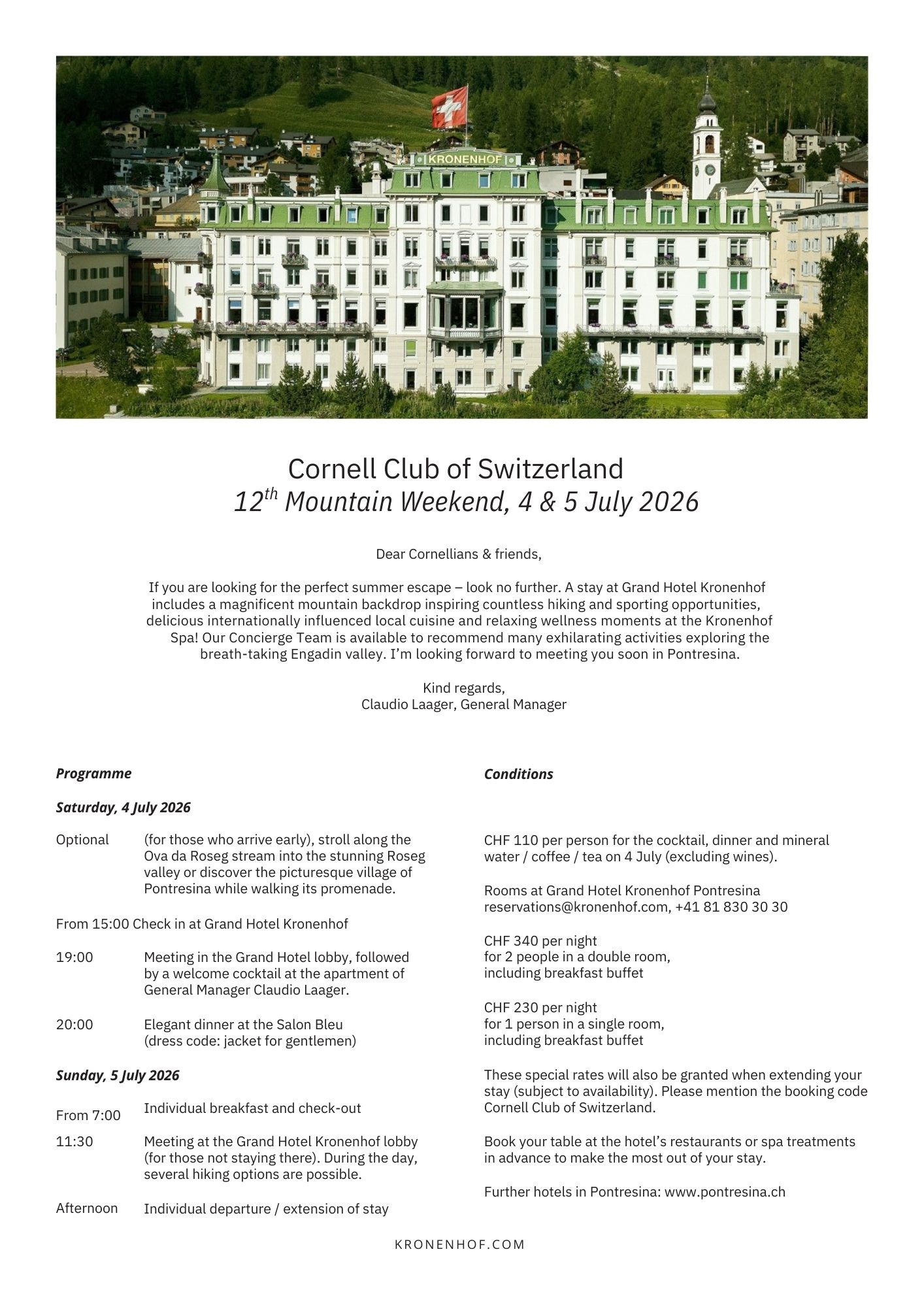 Please register directly with the Grand Hotel Kronenhof and mention the booking code: Cornell Club of Switzerland.